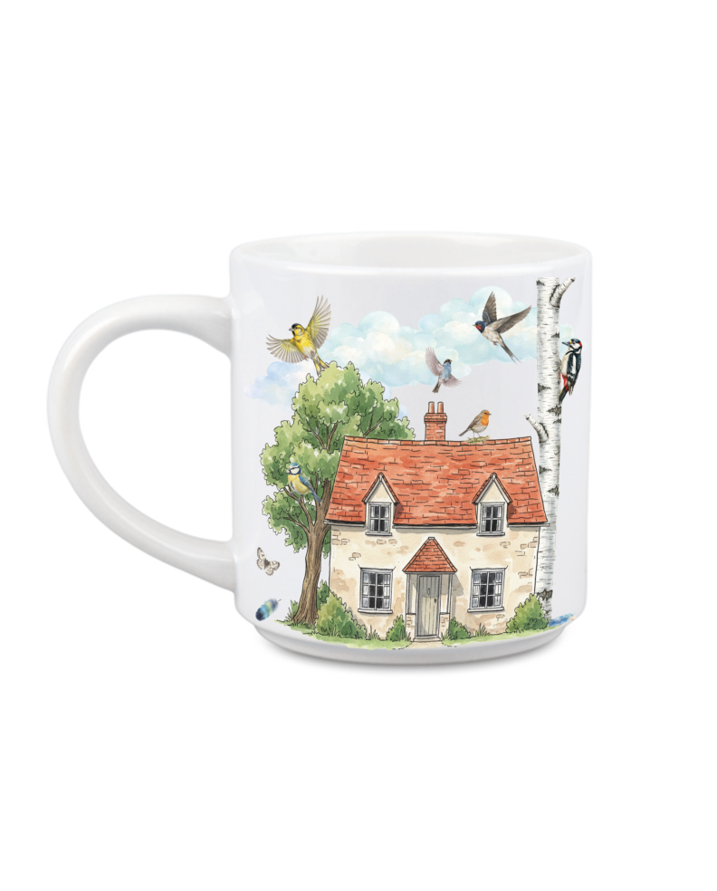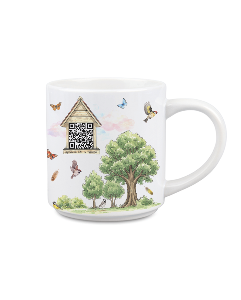 Ten kubek zaprasza do codziennej obserwacji natury! Na ilustracji znajduje się kod QR, który prowadzi do strony z informacjami o ptakach. Treści zmieniają się w zależności od pory roku: pojawiają się nazwy gatunków, ciekawostki i krótkie opisy zwyczajów ptaków, które aktualnie można spotkać.