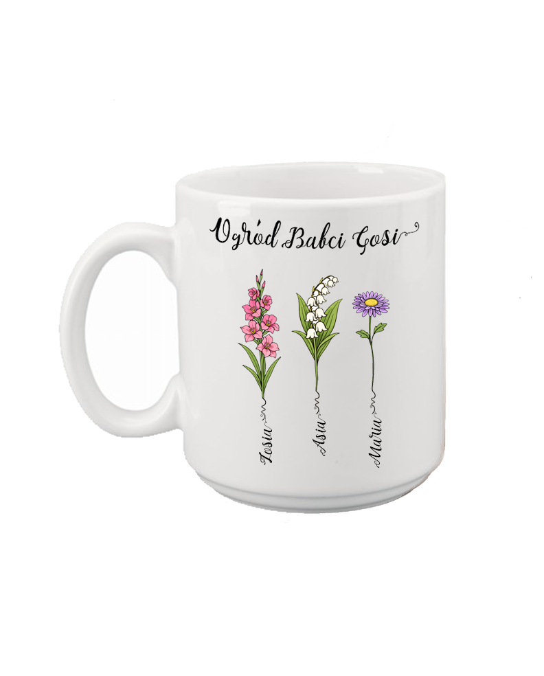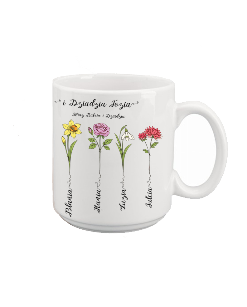 Ten kubek to prosty, a jednocześnie bardzo osobisty prezent. Na kubku znajdują się kwiaty urodzeniowe przypisane do imion, dzięki czemu każdy egzemplarz może być inny i wyjątkowy.