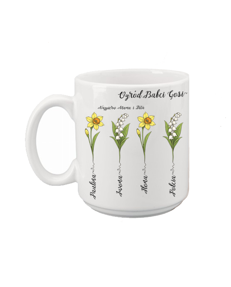 Szczegóły: kubek ceramiczny, nadruk z kwiatami urodzeniowymi i imionami, pojemność 330 ml, można myć w zmywarce.
